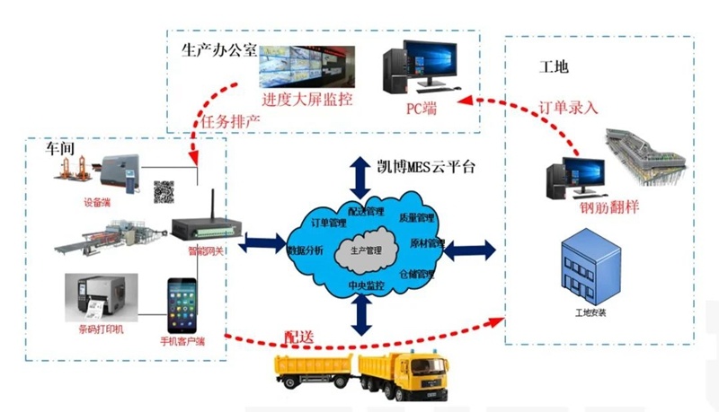 并且,凱博科技攜手中國鐵道科學研究院集團有限公司,開發凱博鋼筋加工管理軟件系統和鋼筋加工遠程控制系統,打造智能控制中心。鋼筋加工管理軟件系統以鋼筋加工過程中物資流管理為核心,借助工業互聯網、云服務、智能設備等技術手段,實現多項目多任務遠程訂單管理,實現訂單排產、生產訂單分發、生產標牌打印、成品完成報工,成品出入庫等功能,同時能夠以電子大屏實現項目訂單動態實時監控、加工廠整體運營狀態的中心化顯示。鋼筋加工遠程控制系統,可實時顯示加工場各種設備生產狀態,同時實現中控室對現場設備啟動和停止的遠程控制,造就了高鐵梁場鋼筋加工數字化新模式!