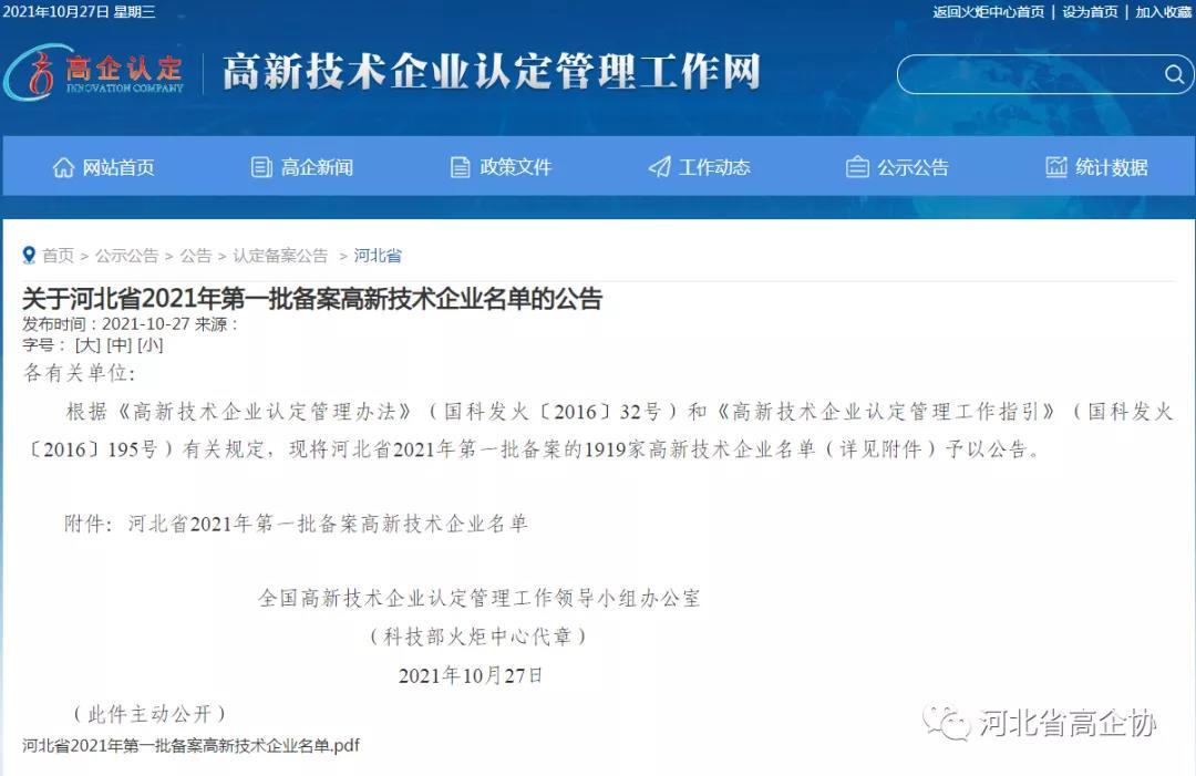 2021年10月27日,科技部火炬中心公示了《河北省 2021 年第一批備案高新技術企業名單》,廊坊凱博建設機械科技有限公司順利通過河北省高新技術企業認定。高新技術企業的取得,將進一步推動公司自主創新、自主研發的進程,從而快速推動公司產業化經營。同時,公司將充分發揮高新技術企業的引領作用,積極創新、突破自我,為公司高質量可持續發展提供科技支撐。